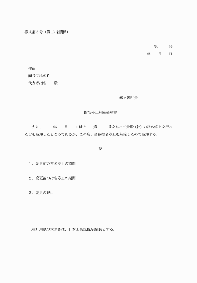5 町長は、指名停止を受けた者が、当該指名停止期間中、町が発注する契約に係る工事等の下請け若しくは受託をし、又は当該工事等の保証人になることを認めてはならない。