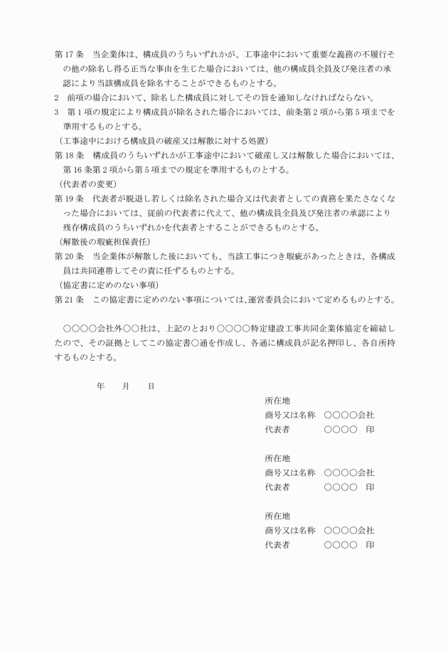 第12条 請負契約を締結した共同企業体は、対象工事の完成後残務整理等に必要な期間として3箇月以上存続させなければならない。